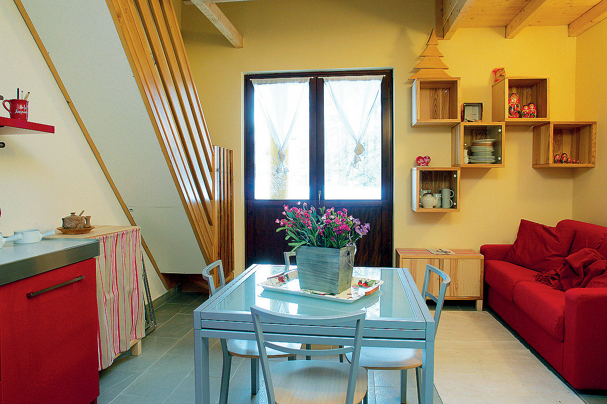 40 m² - 1 spálňa s manželskou posteľou, obývacia izba s kuchynským kútom a rozkladacím gaučom pre 2 osoby, prípadne neuzatvorené zvýšené poschodie v rácmi obývacej izby s manželskou posteľou, sociálne zariadenie, balkón alebo vstup na záhradu