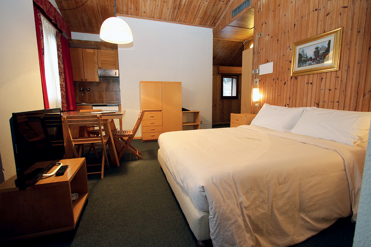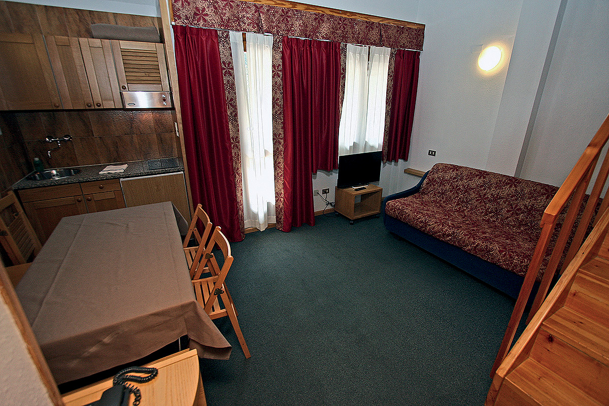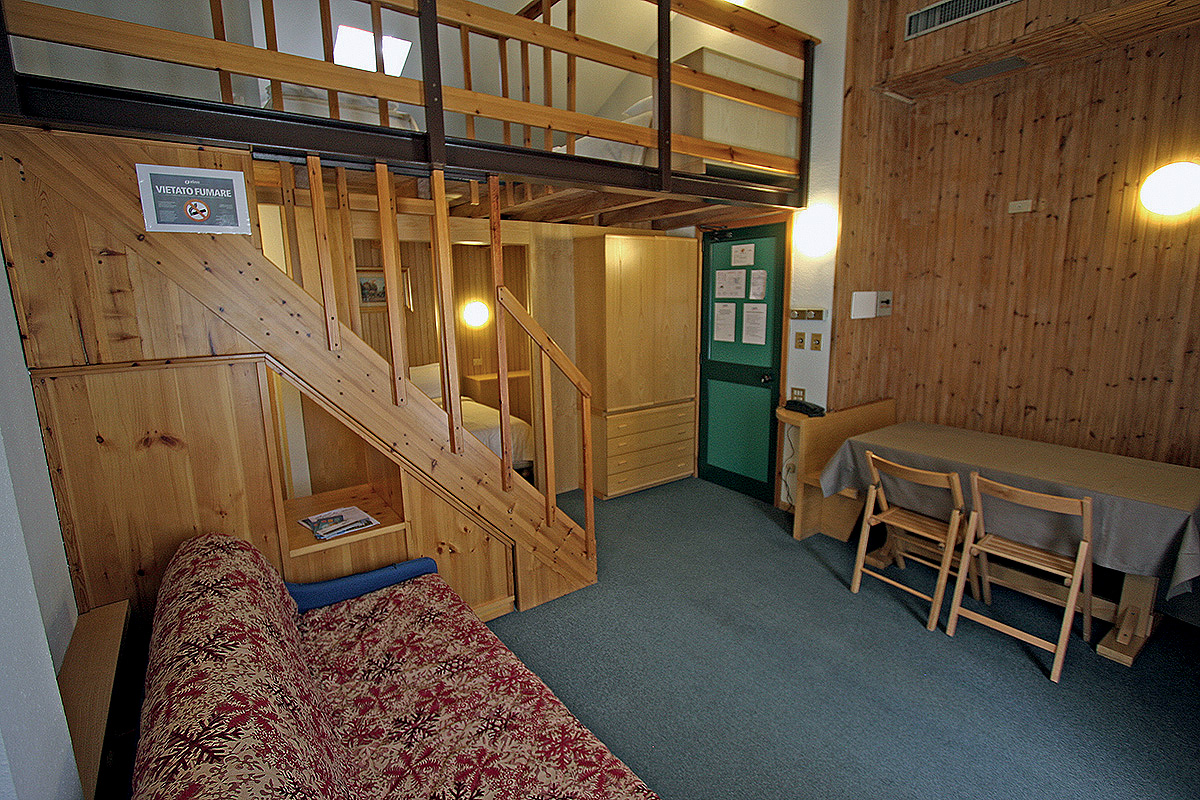 34 m² - 1 spálňa s poschodovou posteľou, obývacia izba s malým kuchynským kútom a rozkladacím gaučom pre 2 osoby, neuzavreté zvýšené poschodie v rámci obývacej izby s manželskou posteľou či 2 samostatnými lôžkami, sociálne zariadenie so sprchou či vaňou, balkón