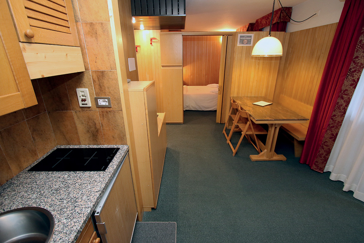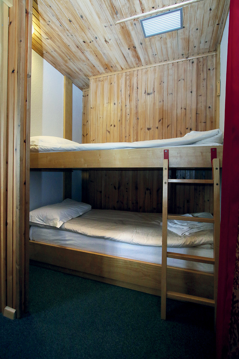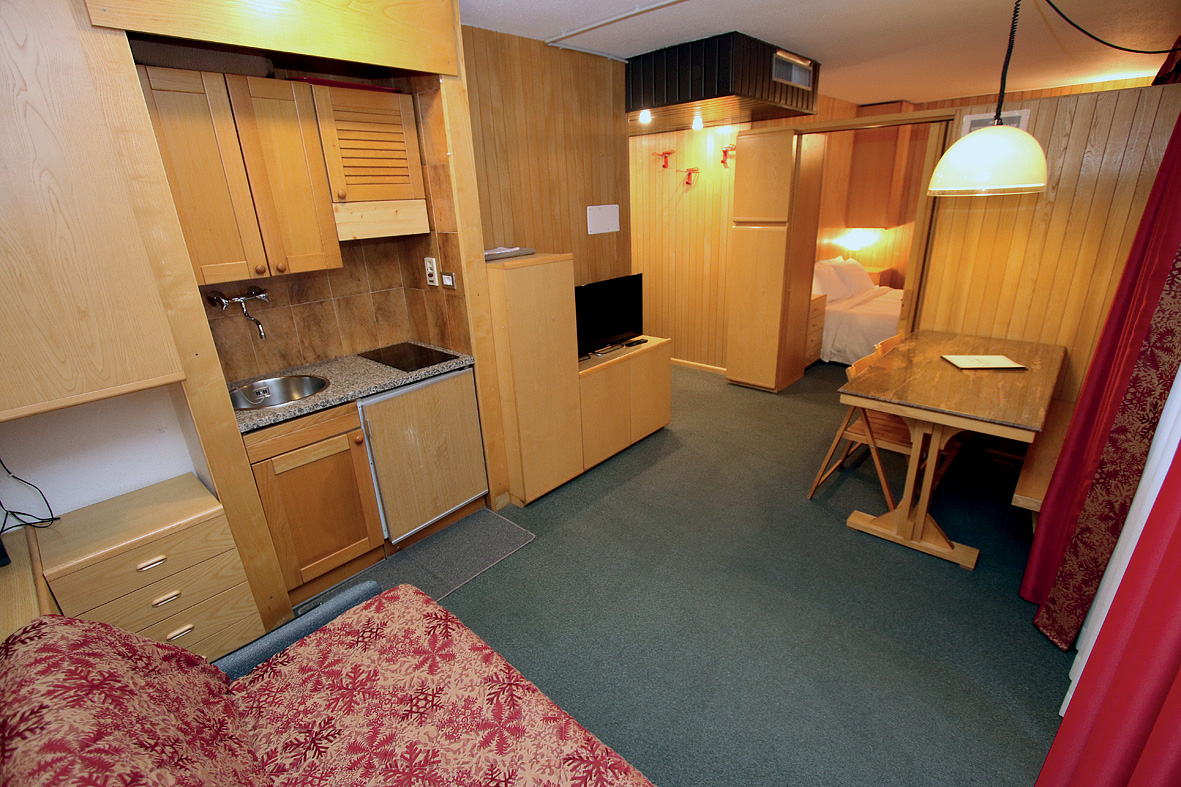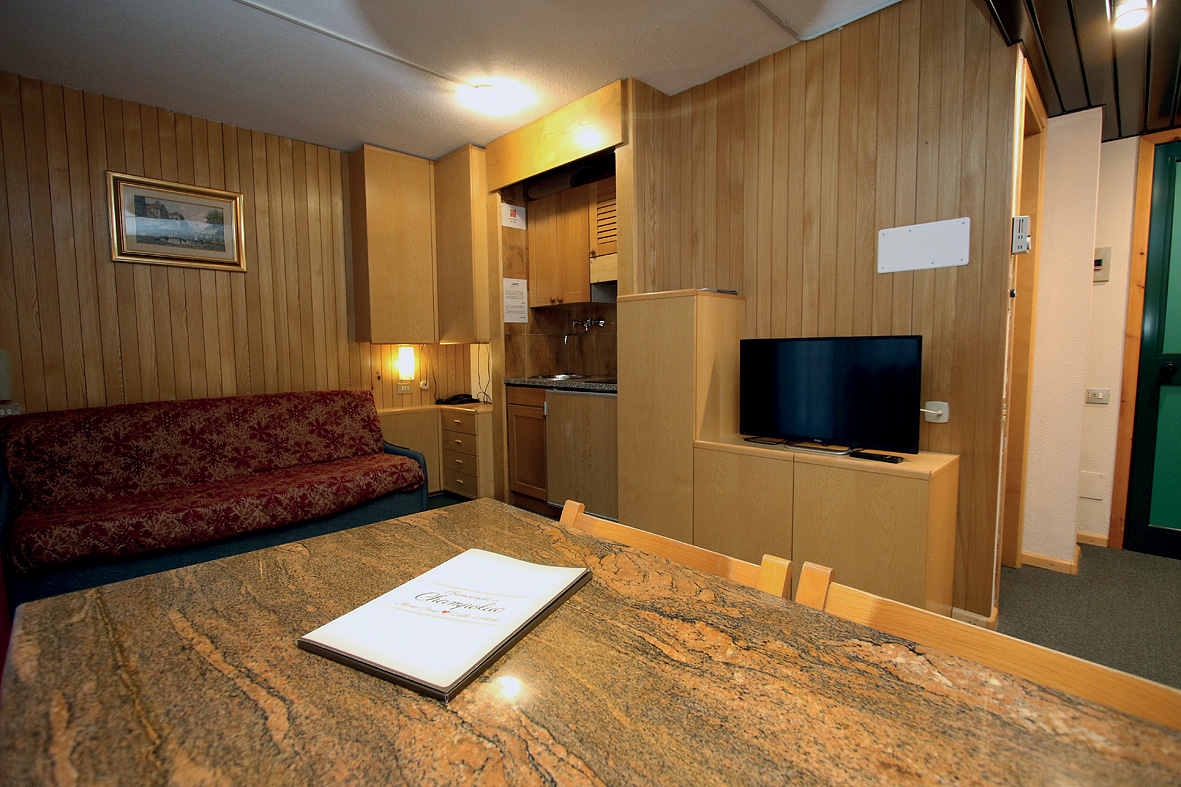 34 m² - 1 spálňa s poschodovou posteľou, obývacia izba s malým kuchynským kútom a rozkladacím gaučom pre 2 osoby, neuzavreté zvýšené poschodie v rámci obývacej izby s manželskou posteľou či 2 samostatnými lôžkami, sociálne zariadenie so sprchou či vaňou, balkón