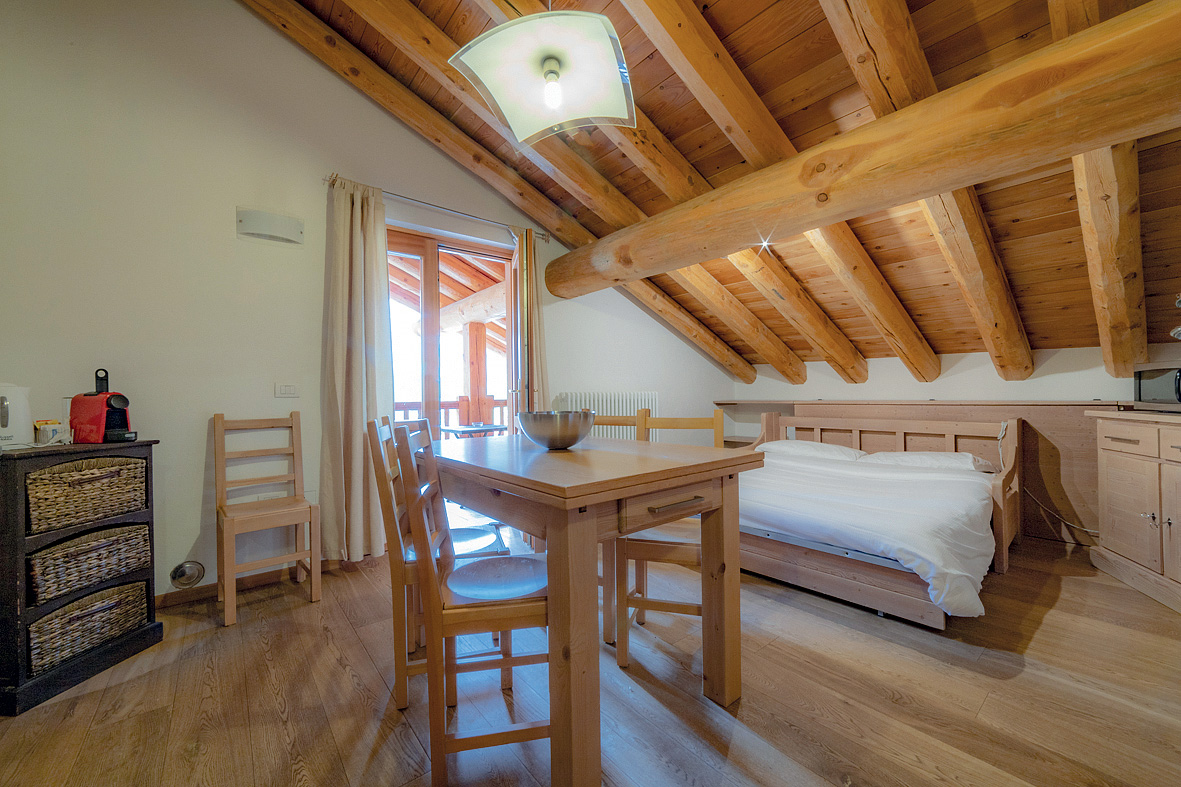 23 m² obývacia izba s kuchynským kútom, manželskou posteľou či 2 samostatnými lôžkami a 1 ďalším samostatným lôžkom, sociálne zariadenie, balkón