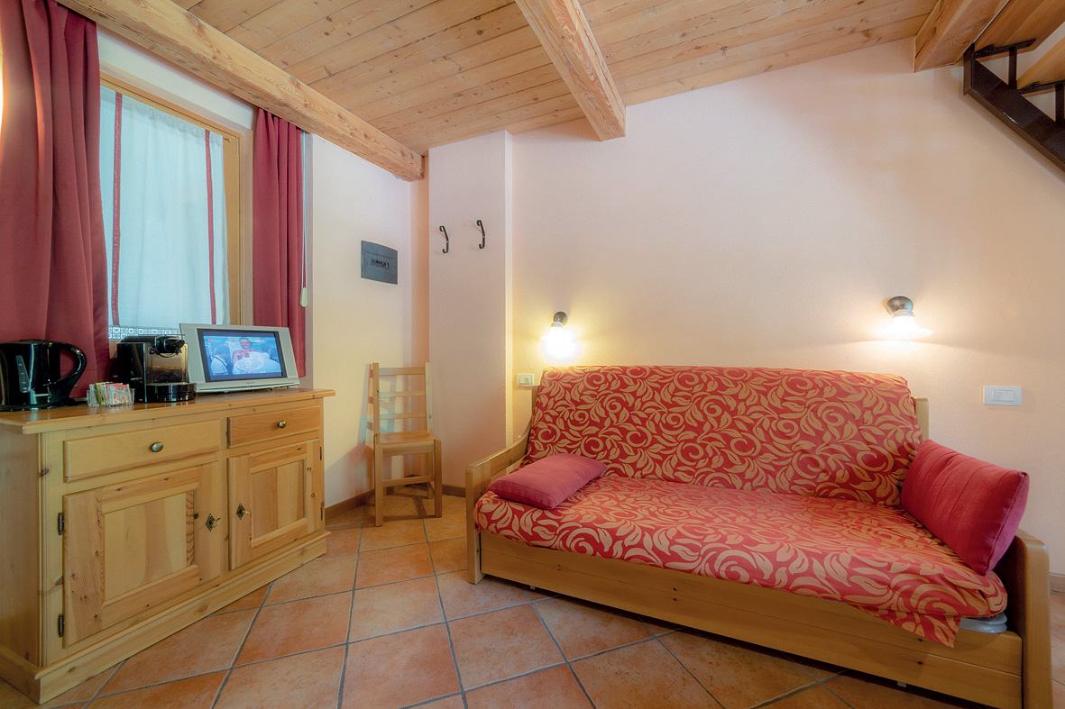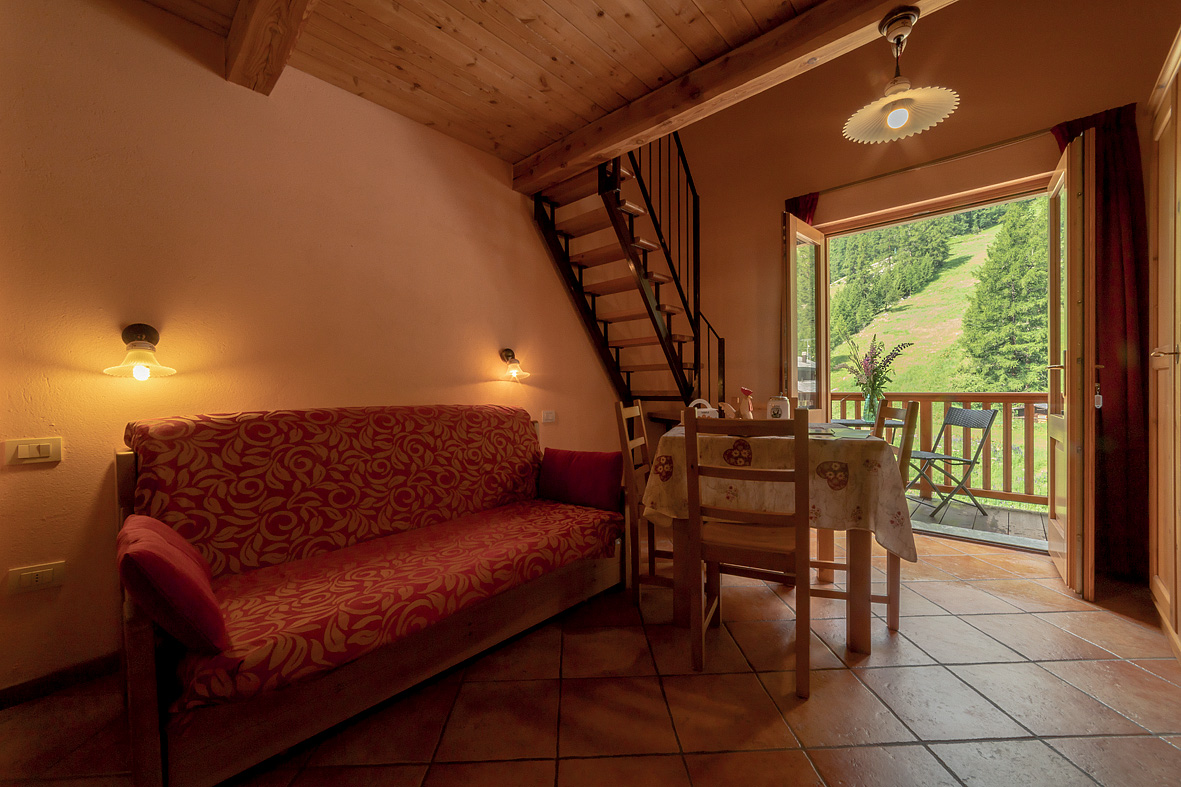 25 m² obývacia izba s kuchynským kútom a rozkladacím gaučom pre 2 osoby, neuzatvorené zvýšenie poschodie v rámci obývacej izby s manželskou posteľou či 2 samostatnými lôžkami, sociálne zariadenie, balkón