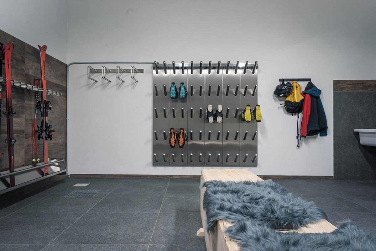 recepcia, menšie lobby, úschovňa lyží a úschovňa lyžiarskych topánok, garážové státie, parkovacie státie