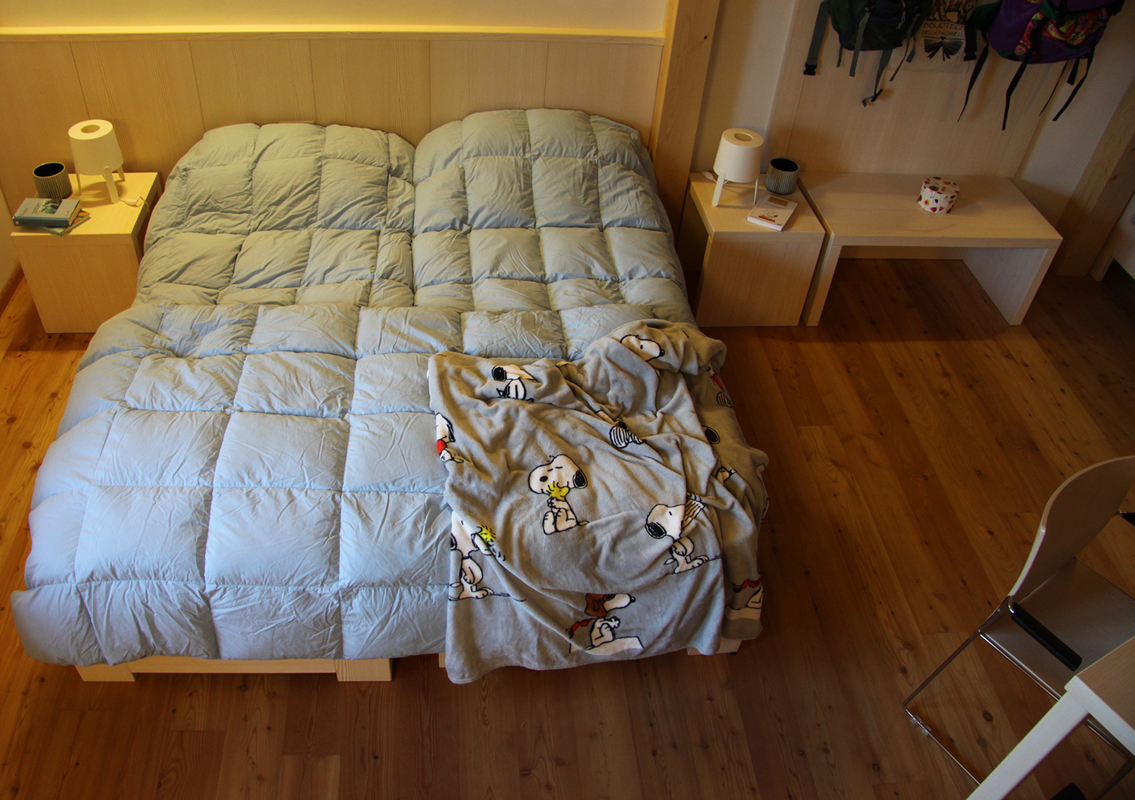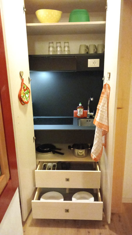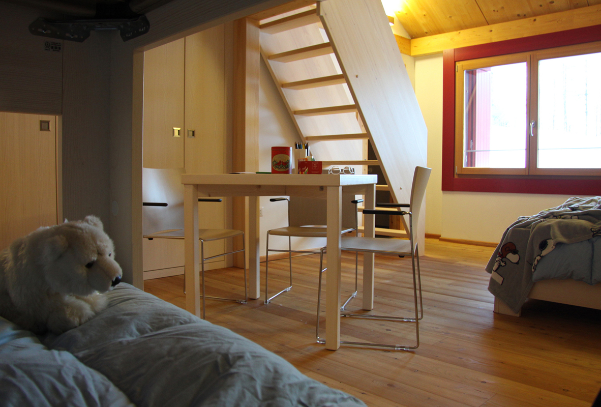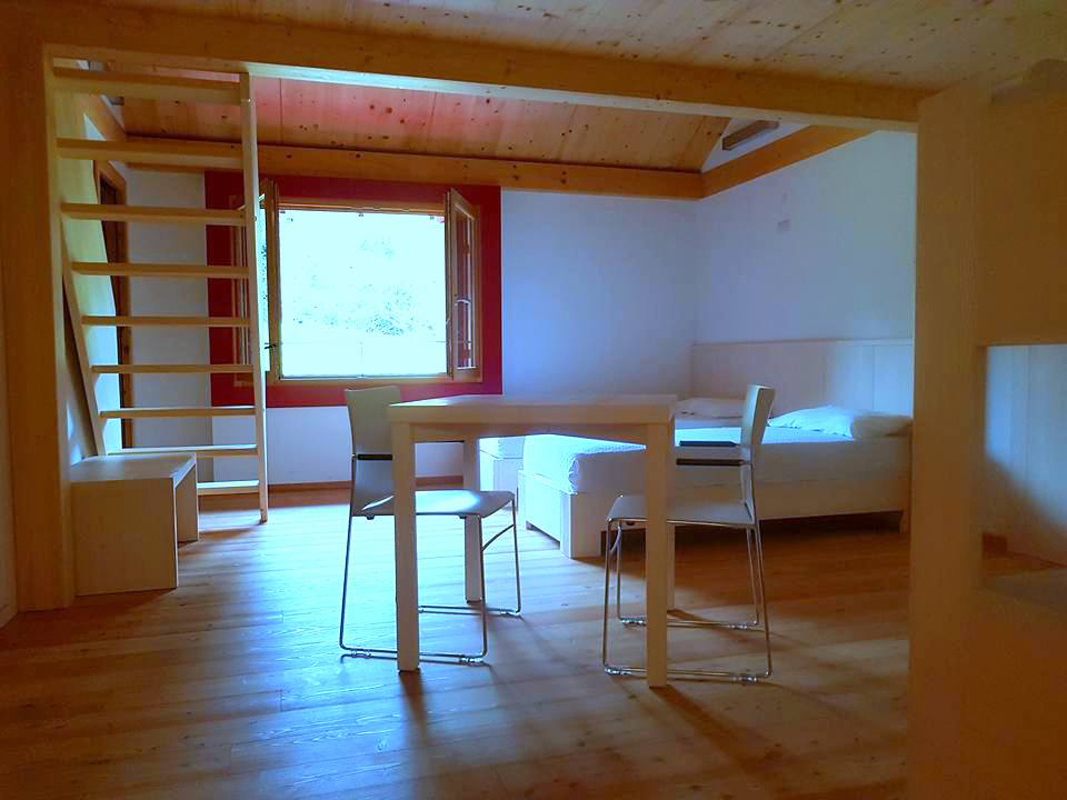44 m² - obývacia izba s menším uzatváracím kuchynským kútom, manželským lôžkom pre 2 osoby a poschodovou posteľou, neuzatvorené medziposchodie s 2 samostatnými lôžkami či maželským lôžkom, sociálne zariadenie