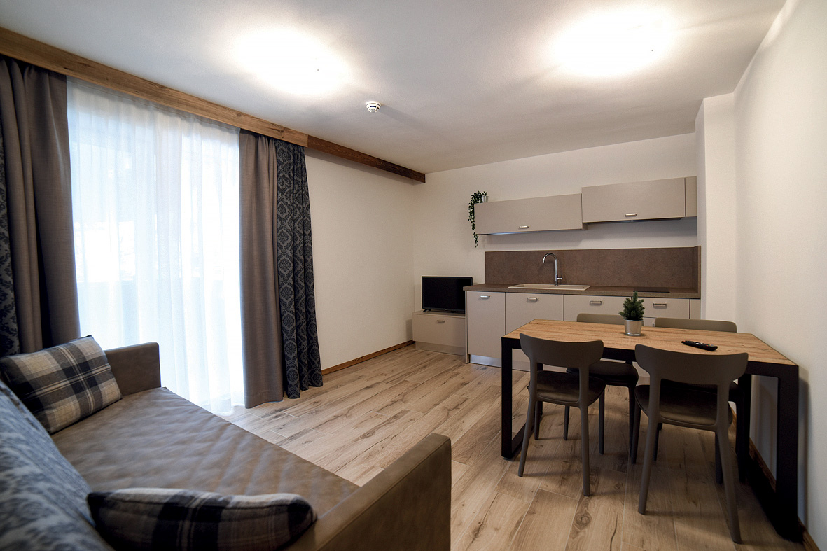 55 m² - 2 spálne s manželskou posteľou s oddeliteľnými lôžkami, obývacia izba s kuchynským kútom a rozkladacím gaučom typu "zásuvka" pre 2 osoby, sociálne zariadenie, balkón