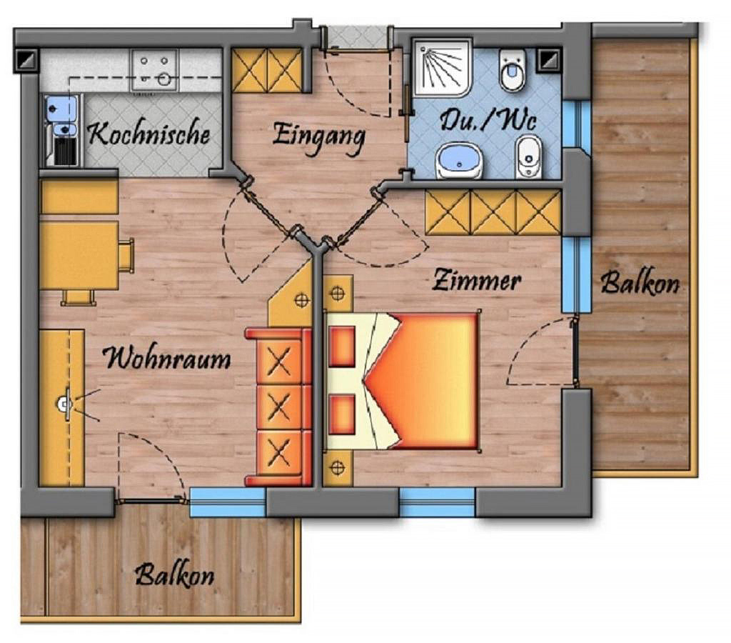 45 m² - 1 spálňa s manželskou posteľou, obývacia izba s kuchynským kútom a rozkladacím gaučom pre 2 osoby, sociálne zariadenie, 2x balkón