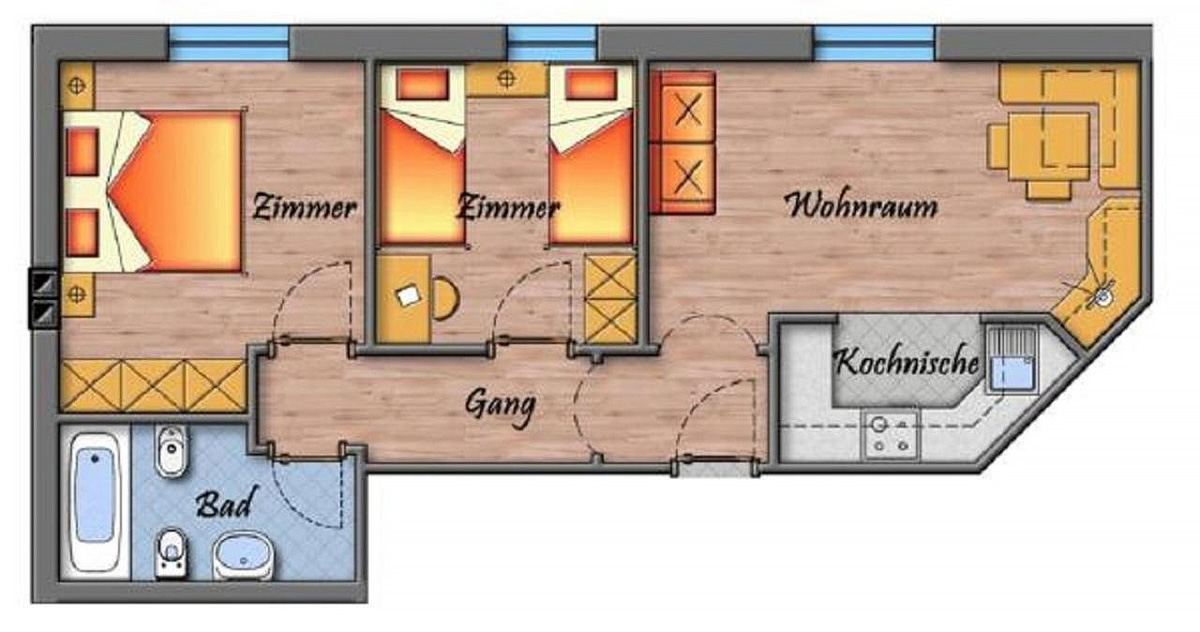 46 m² - 1 spálňa s manželskou posteľou, spálňa s 2 samostatnými lôžkami, obývacia izba s kuchynským kútom, sociálne zariadenie, balkón