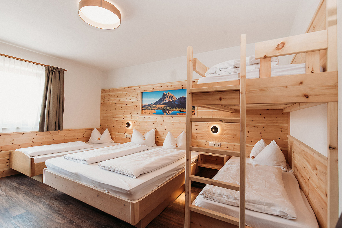 Family 3/4/5 - 21 až 27 m² - izba s manželskou posteľou a poschodovou posteľou a prípadne rozkladacím gaučom pre 1 osobu, sociálne zariadenie, balkón s panoramatickým výhľadom na hory