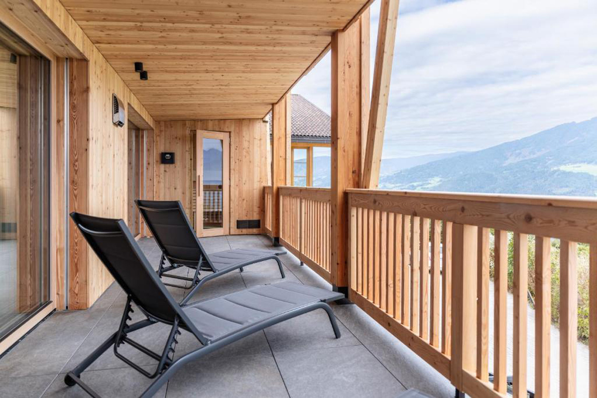 trilo 4+2 Premium - 75 m² - 2 spálne s manželskou posteľou, obývacia izba s kuchynským kútom a rozkladacím gaučom pre 2 osoby, 2× sociálne zariadenie so sprchou, balkón 25 m; na balkóne privátna sauna, lehátko a kresielko