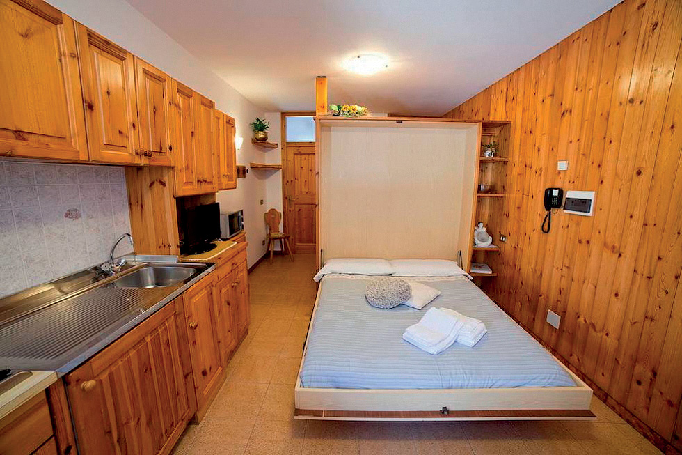 bilo 3/4 - 1 spálňa s manželskou posteľou, obývacia izba s kuchynským kútom a rozkladacím gaučom typu "zásuvka" pre 1 či 2 osoby, sociálne zariadenie, balkón či terasa