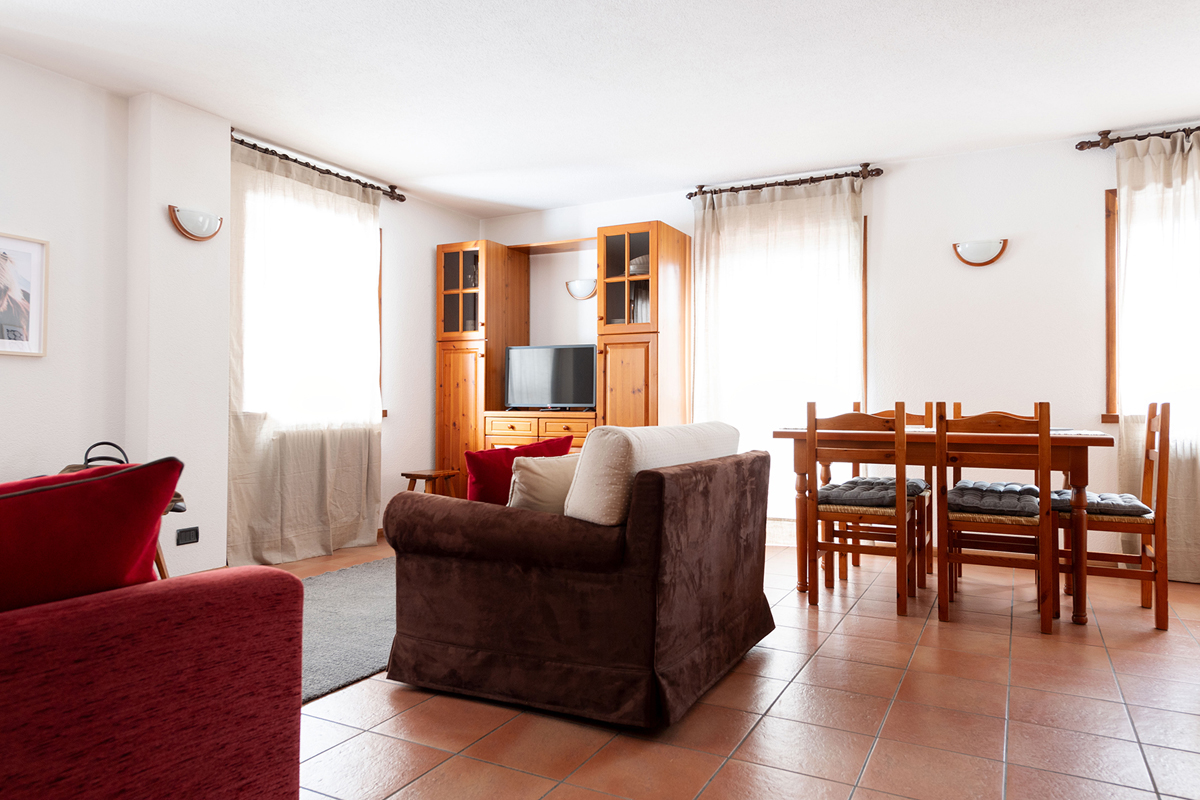1 spálňa s manželskou posteľou, obývacia izba s kuchynským kútom a rozkladacou pohovkou pre 2 osoby alebo 2 rozkladacími pohovkami pre 1 osobu, sociálne zariadenie s vaňou, balkón; apartmán sa nachádza na 2. poschodí