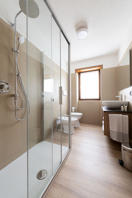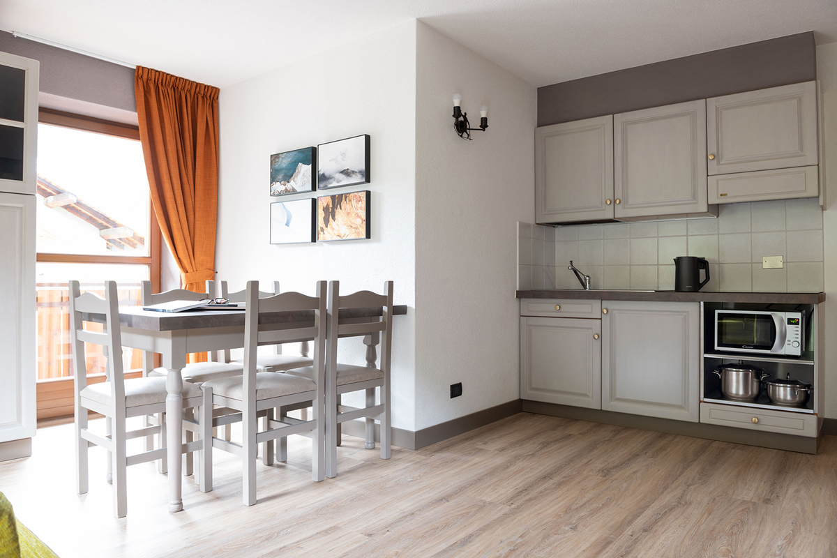 1 spálňa s manželskou posteľou, obývacia izba s kuchynským kútom a rozkladacou pohovkou pre 2 osoby alebo 2 rozkladacími pohovkami pre 1 osobu, sociálne zariadenie so sprchou, balkón; apartmán sa nachádza na úrovni vchodu