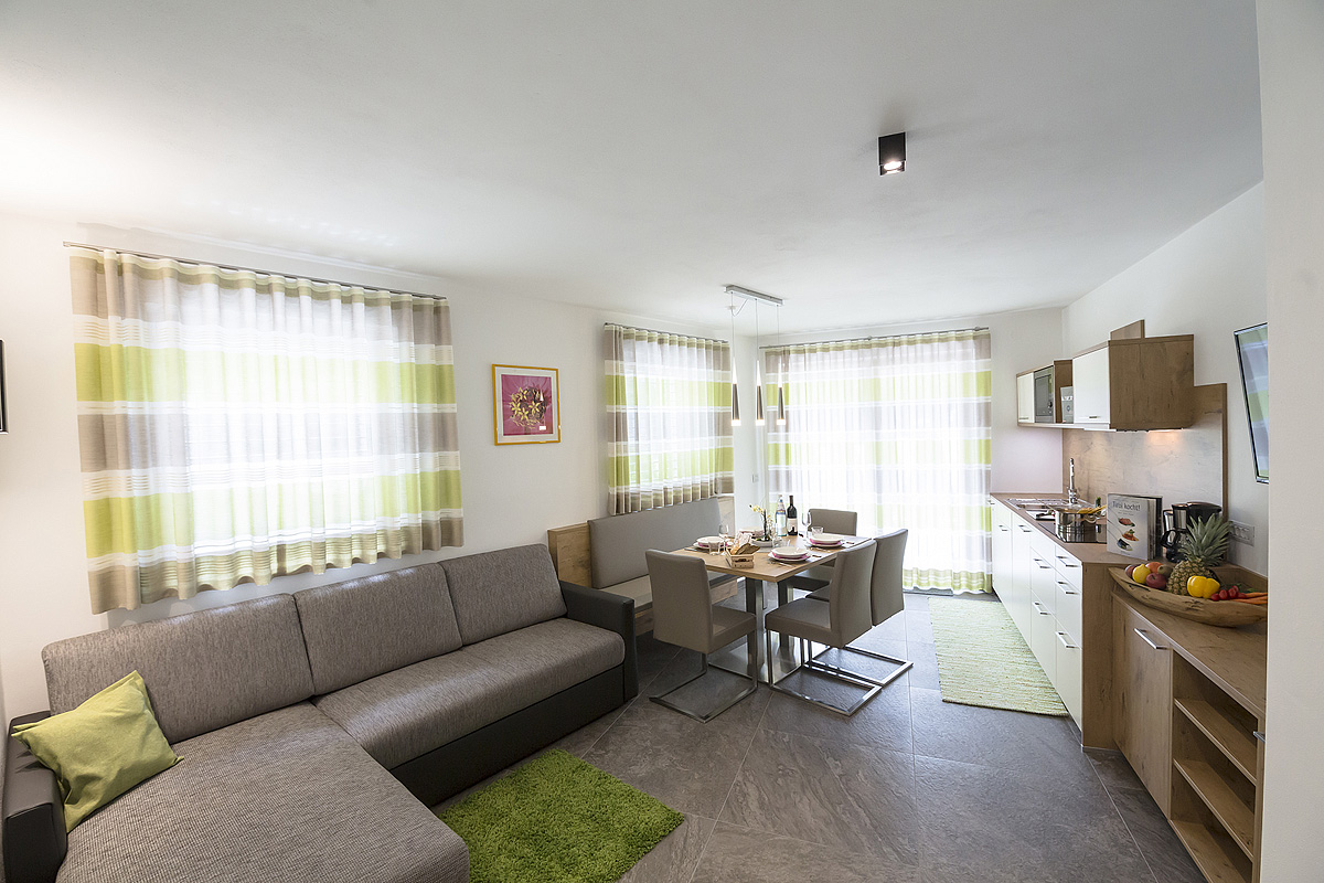 55 m² - 1 spálňa s manželskou posteľou, 1 spálňa s poschodovou posteľou a výsuvným lôžkom, obývacia izba s kuchynským kútom, sociálne zariadenie, terasa so vstupom do záhrady, maximálna obsadenosť apartmánu sú 3 dospelé osoby a 3 deti do nedovŕšených 14 rokov