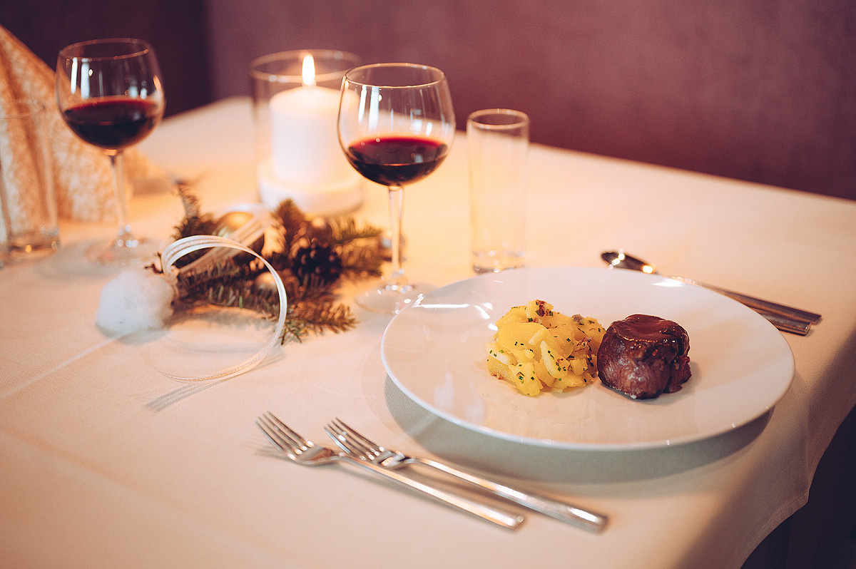servírované menu s výberom z 2 teplých predkrmov, 2 hlavných jedál s prílohou a 2 až 3 dezertov alebo ovocia, šalátový bufet; nápoje za príplatok