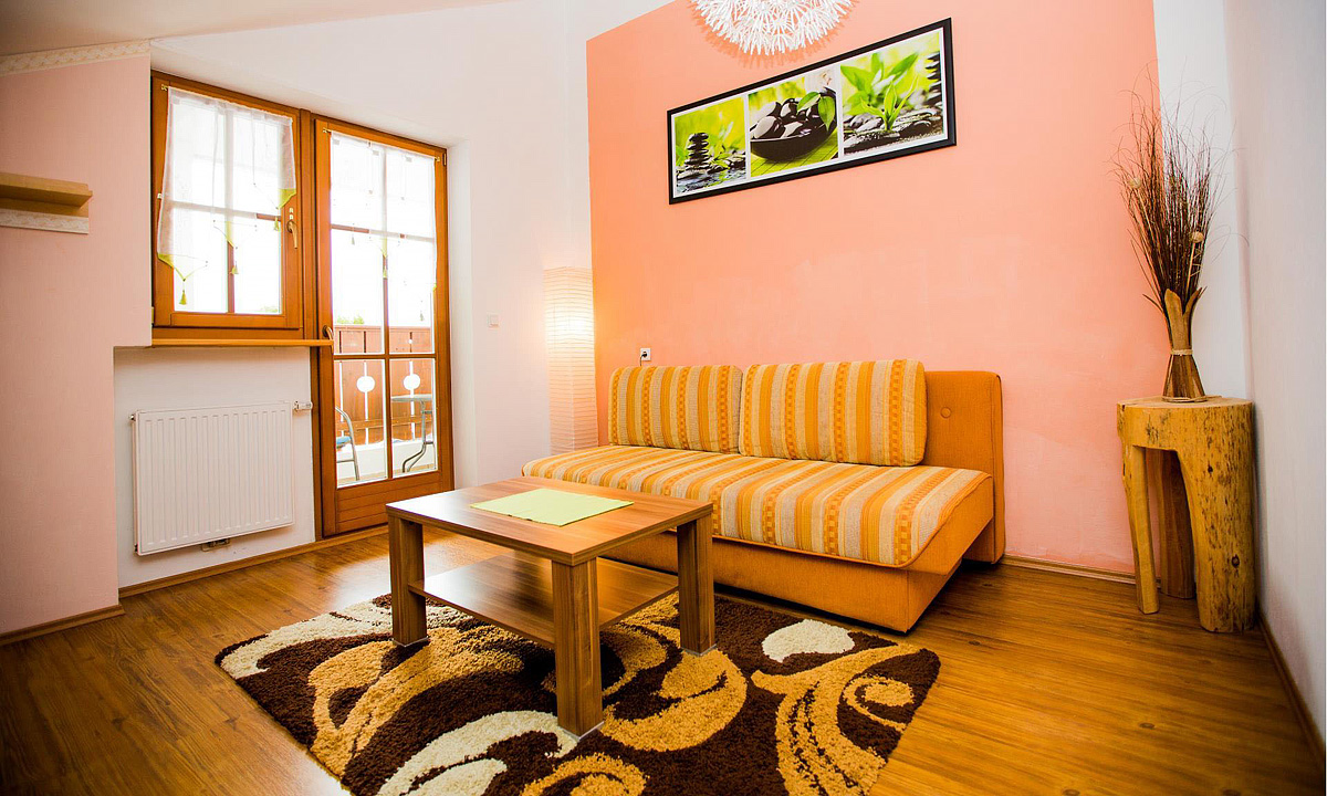 50 až 60 m² 1 spálňa s manželskou posteľou, 1 spálňa s 1 samostatným lôžkom a poschodovou posteľou, obývacia izba s kuchynským kútom, sociálne zariadenie, balkón