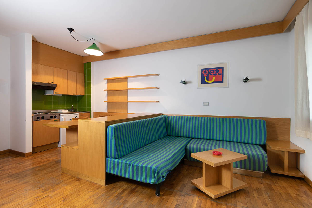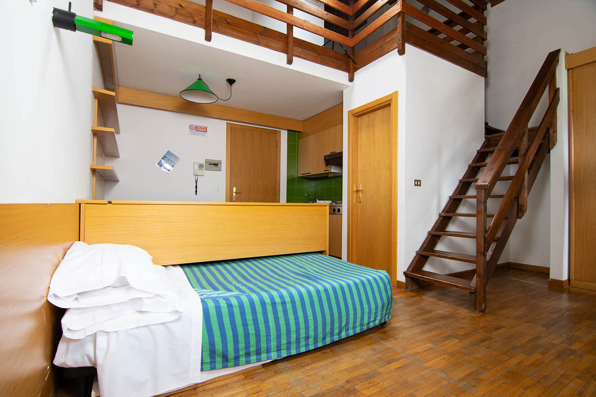 22 až 26 m² - obývacia izba s kuchynským kútom, atypickou vysúvacou manželskou posteľou a rozkladacím gaučom typu "zásuvka" pre 2 osoby (v niektorých apartmánoch v rámci neuzavretého zvýšeného poschodia), možnosť 1 prístelky, sociálne zariadenie, zriedka balkón