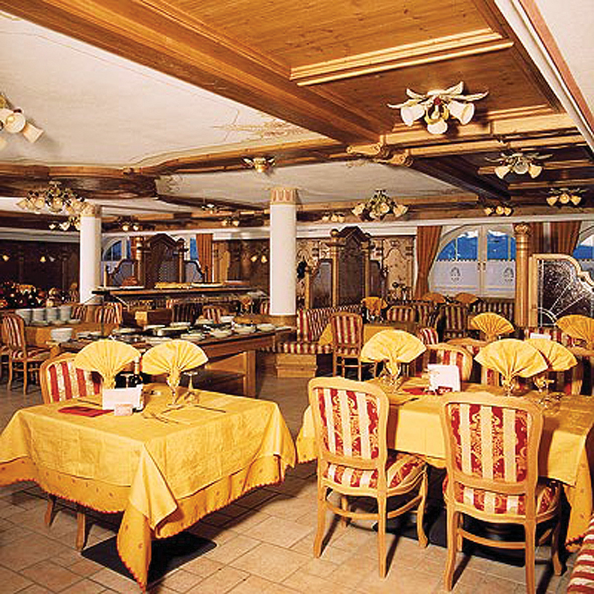 večera - servírované menu s výberom z 3 teplých predjedál a 3 hlavných jedál s prílohou, bohatý šalátový bufet, dezerty a ovocie formou bufetu, spravidla bufet porciovanej pizze, nápoje za poplatok; 1x týždenne typická večera pri sviečkach
