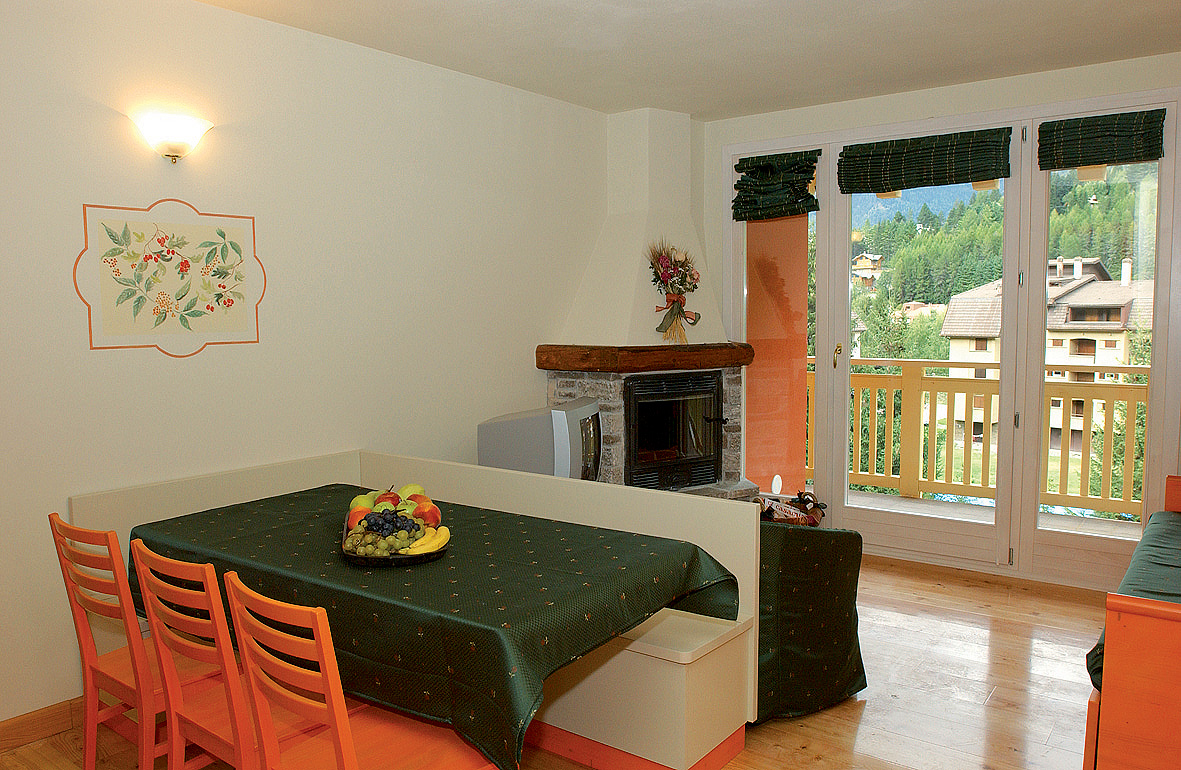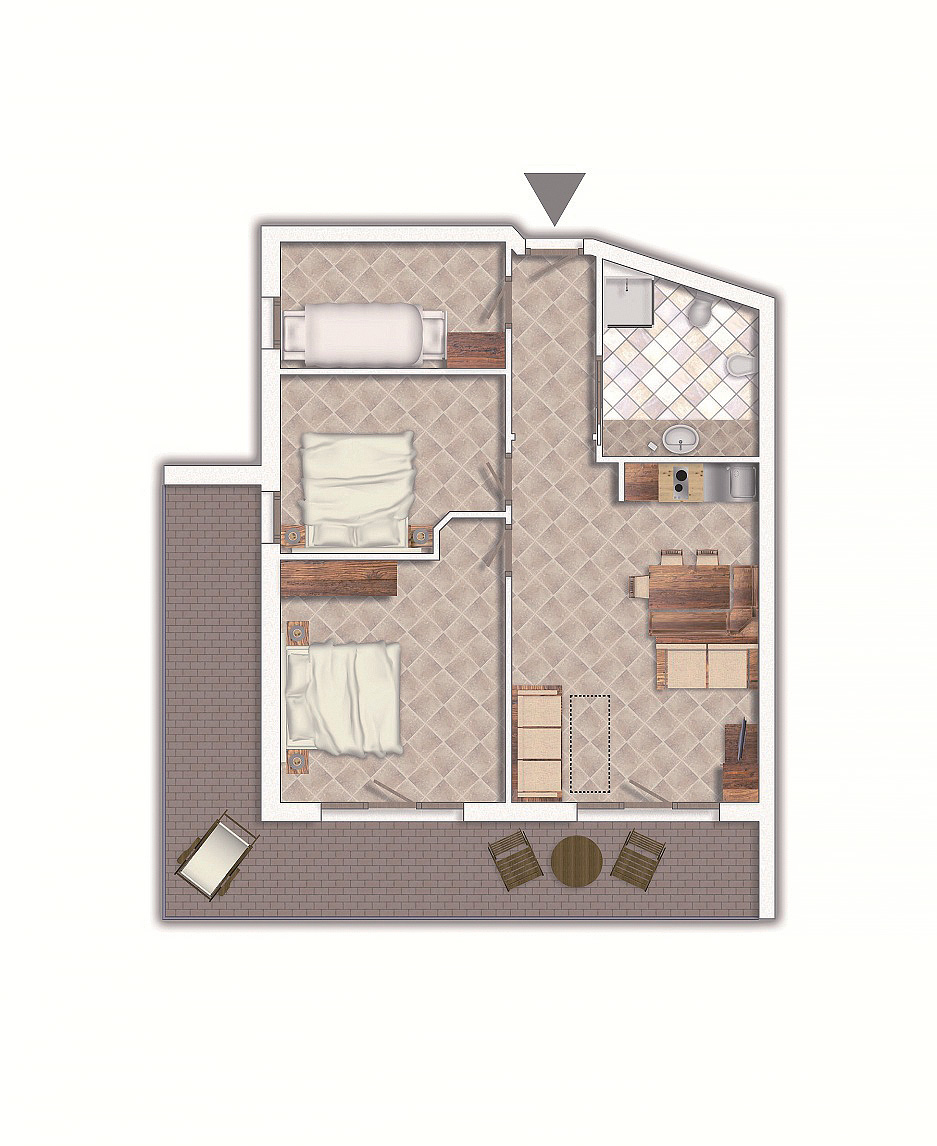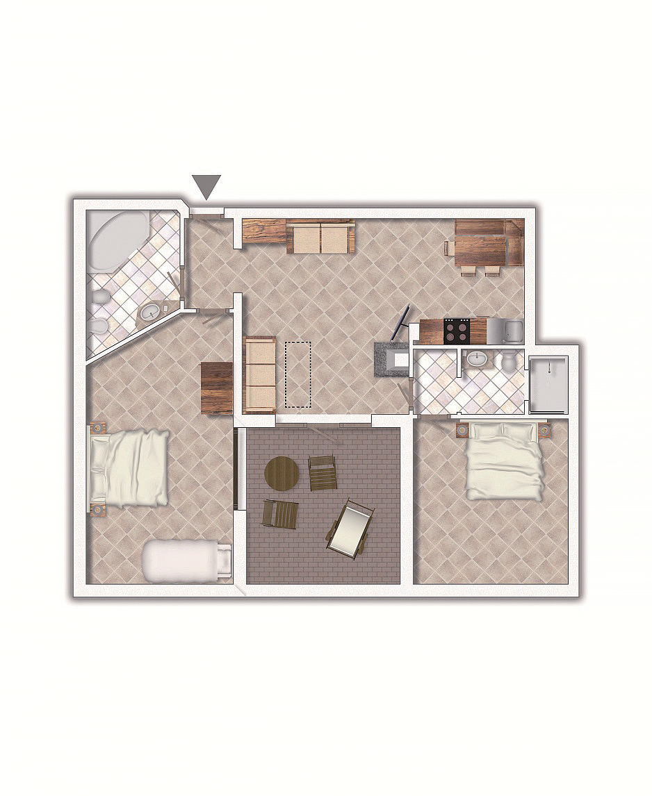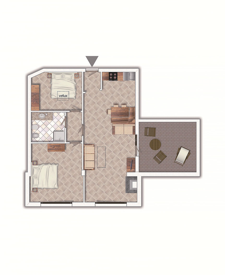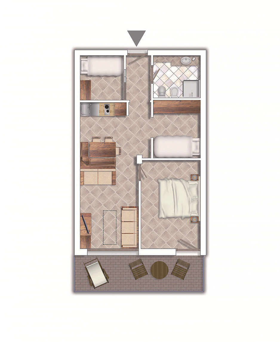 50 m² - 1 spálňa s manželskou posteľou, 1 menšia spravidla neuzatvorená spálňa bez okna s poschodovou posteľou, obývacia izba s kuchynským kútom a rozkladacím gaučom typu "zásuvka" pre 2 osoby, sociálne zariadenie, balkón; maximálne obsadenie apartmánu je 5 osôb