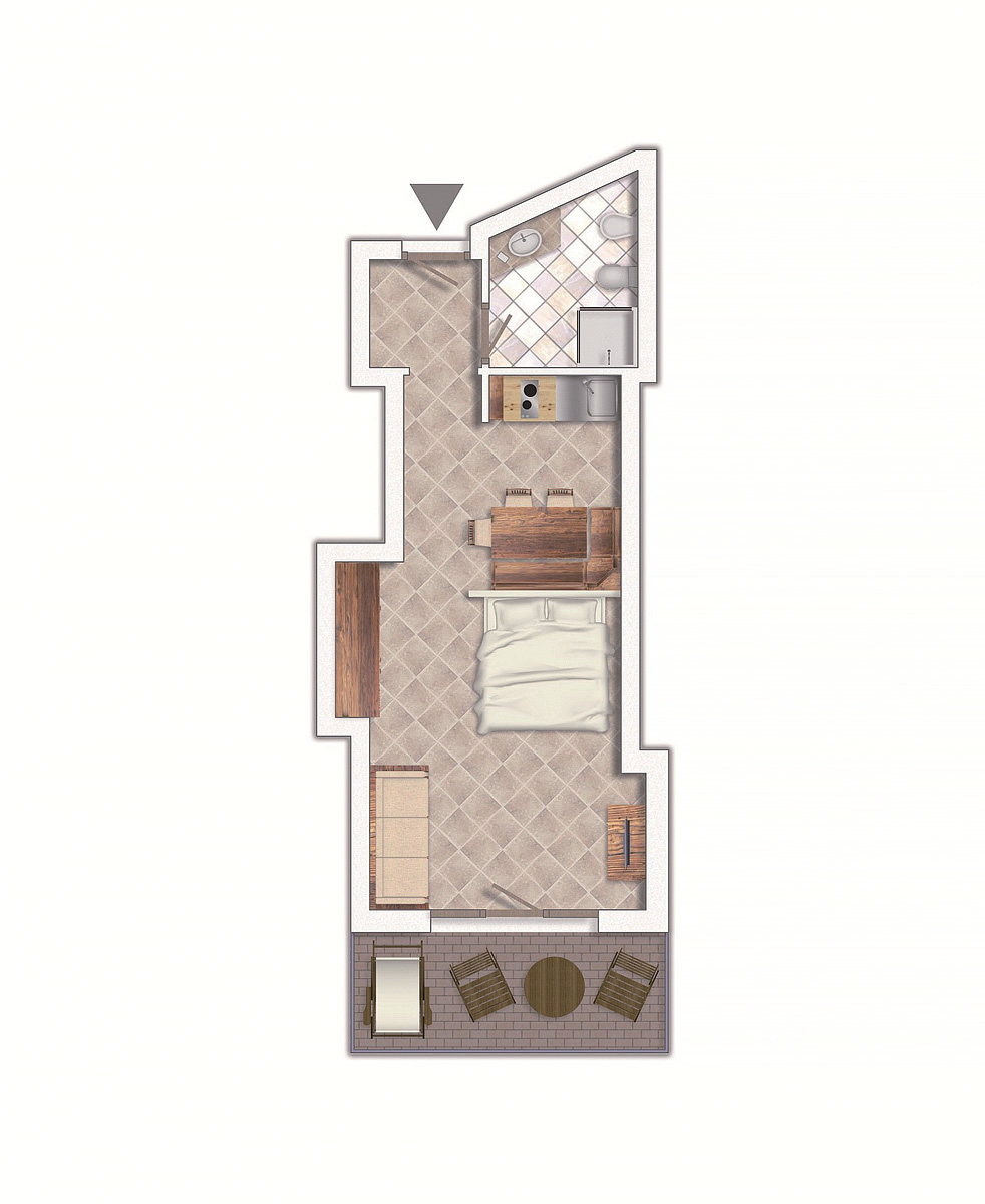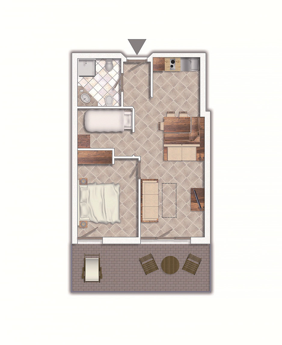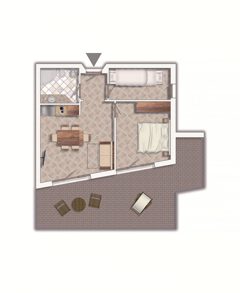 45 m² - 1 spálňa s manželskou posteľou, obývacia izba s kuchynským kútom, rozkladacím gaučom typu "zásuvka" pre 2 osoby a prípadne prístelkou, sociálne zariadenie, balkón; niektoré apartmány sú situované v podkroví