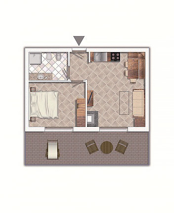 mono 2/3 - 30 m² - obývacia izba s kuchynským kútom, manželskou posteľou a prípadne rozkladacím gaučom pre 1 osobu, sociálne zariadenie, balkón