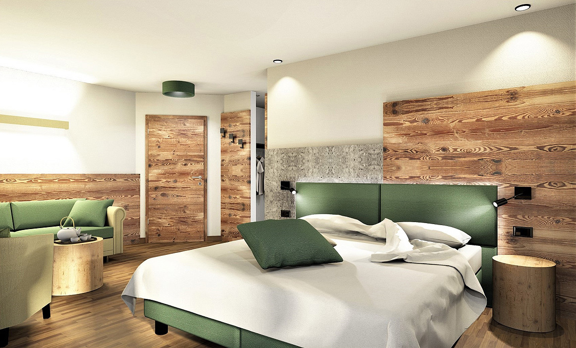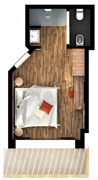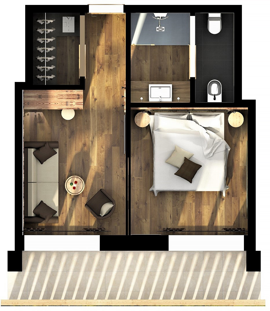 28 m² - izba s manželskou posteľou a prípadne rozkladacím gaučom pre 1 alebo 2 osoby, sociálne zariadenie, balkón; izby môžu byť oddelené len čiastočne stenou