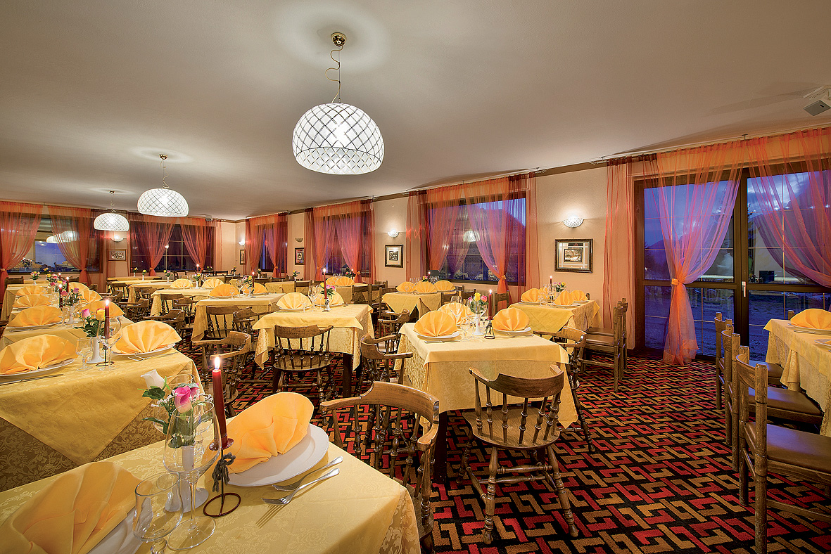 servírované menu s výberom z 3 teplých predjedál, 3 hlavných jedál s prílohou a 3 dezertov, studené predjedlá a šaláty formou bufetu, nápoje za poplatok; 1x týždenne typická večera