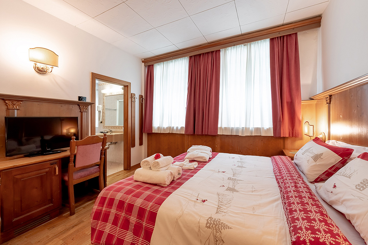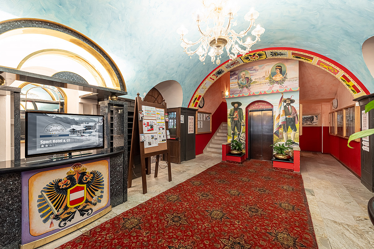 vybavenosť a služby - recepcia / wi-fi pripojenie k internetu, 2x reštaurácia vyhradená pre hotelových hostí, reštaurácia / pizzeria, bar s TV sat. / 1x týždenne piano bar, bar / spoločenská miestnosť s pecou, ​​diskopub, spoločenská miestnosť, spoločenská miestnosť s TV sat., videom, DVD a veľkoplošnou projekciou / hotelové kino / vybavená kongresová sála* až pre 100 osôb, typická spoločenská miestnosť, slnečná terasa s ležadlami, služba stráženia detí* (v talianskom a anglickom jazyku), 2x týždenne animačné programy, úschovňa lyží a lyžiarok, 3x výťah, parkovanie (počet miest obmedzený; ďalšie parkovanie vdialené cca 350 m), garážové státie*