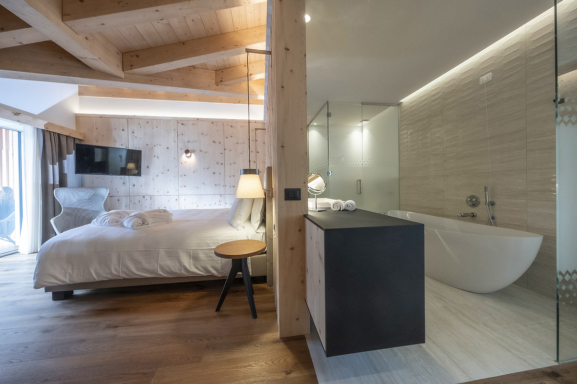 Junior Suite Cima Dodici vista 2/3 - 30 m² - izba s manželskou posteľou a prípadne s rozkladacím gaučom pre 1 osobu, sociálne zariadenie, terasa či balkón s panoramatickým výhľadom