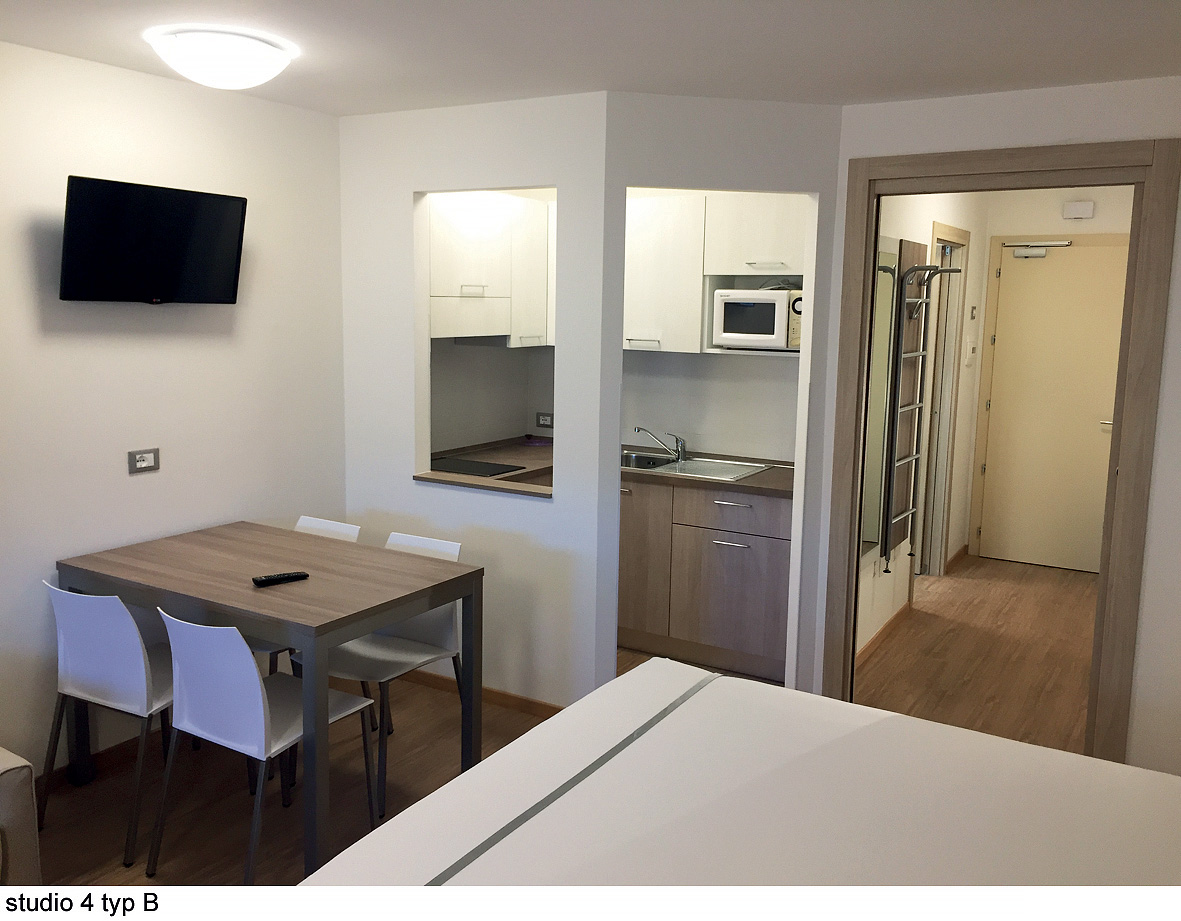 25 m² obývacia izba s kuchynským kútom a manželskou posteľou či so skriňovou manželskou posteľou, sociálne zariadenie, balkón alebo terasa; niektoré apartmány sú situované v podkroví