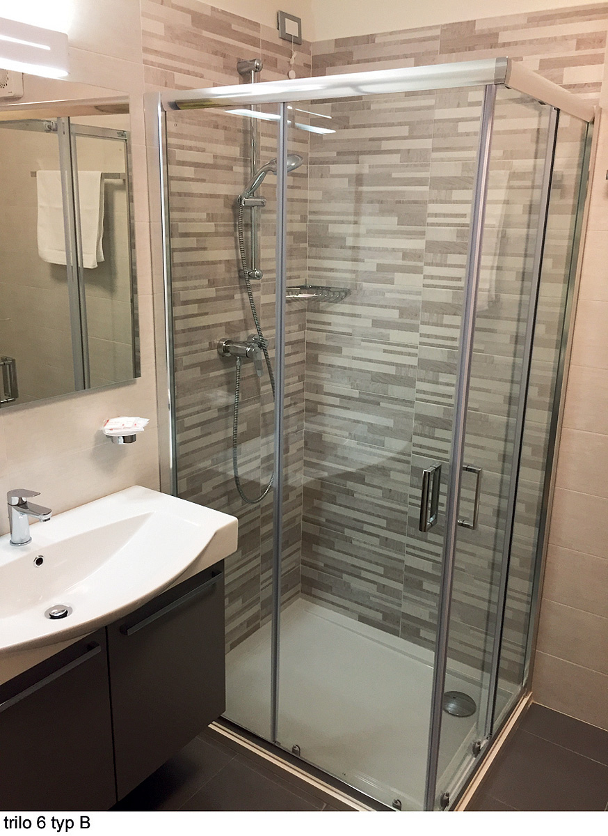 45 m² - 1 spálňa s manželskou posteľou, 1 spálňa s 2 samostatnými lôžkami, obývacia izba s oddeleným kuchynským kútom a rozkladacím gaučom pre 2 osoby, sociálne zariadenie, balkón; apartmány sú situované v podkroví; trilo 6 sud s výhľadom do údolia