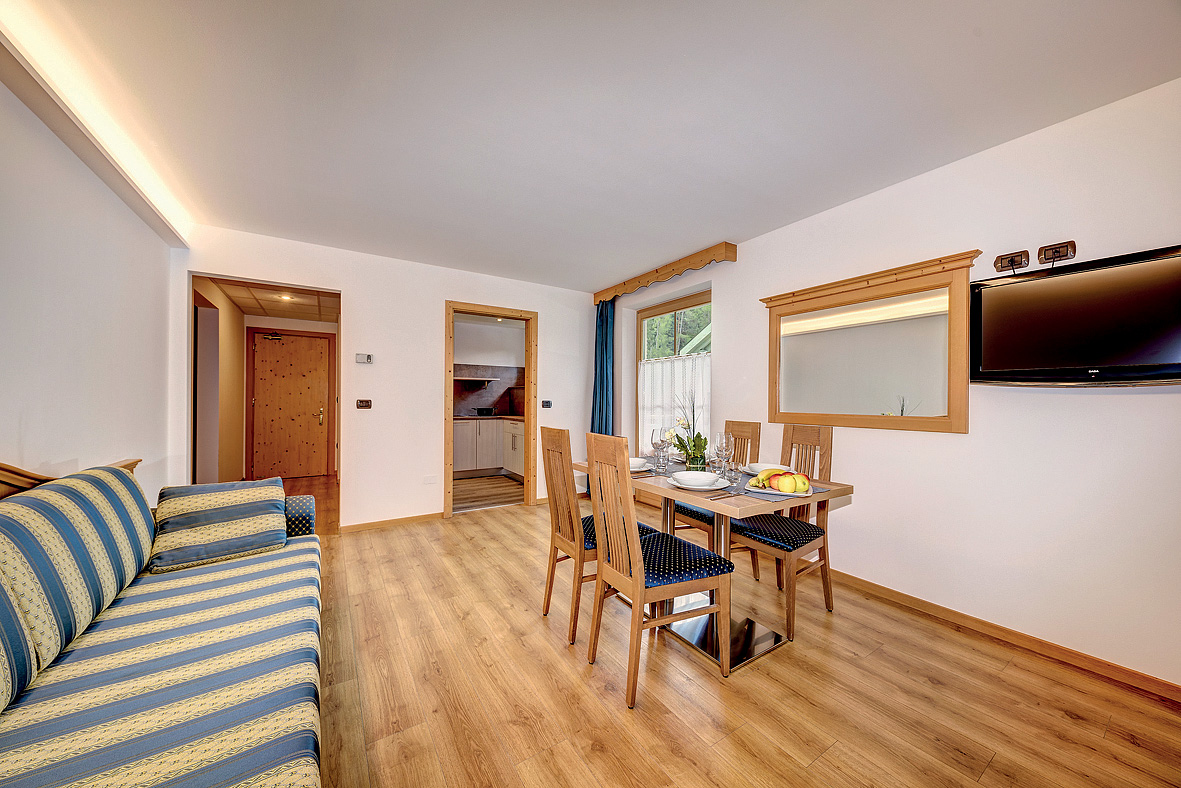 50 m² - 1 spálňa s manželskou posteľou a prípadne 1 samostatným lôžkom, ďalšia spálňa s manželskou posteľou s oddelenými lôžkami, obývacia izba s kuchynským kútom a rozkladacím gaučom pre 2 osoby, vstupná miestnosť, sociálne zariadenie; niektoré apartmány sú situované v podkroví