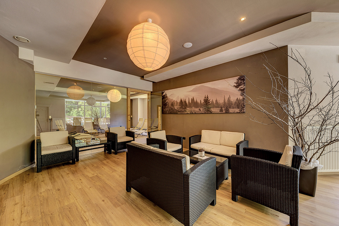 bazén atypického tvaru s detským bazénikom, vonkajší vyhrievaný bazén, vírivka až pre 8 osôb, vonkajšia vírivka až pre 8 osôb, sauna, biosauna, aromatická para, ľadový kúpeľ, 2x multifunkčná sprcha, vertikálne solárium*, relaxačný kútik s ležadlami, masáže*, posilňovňa, biliard*, stolný tenis, stolný futbal