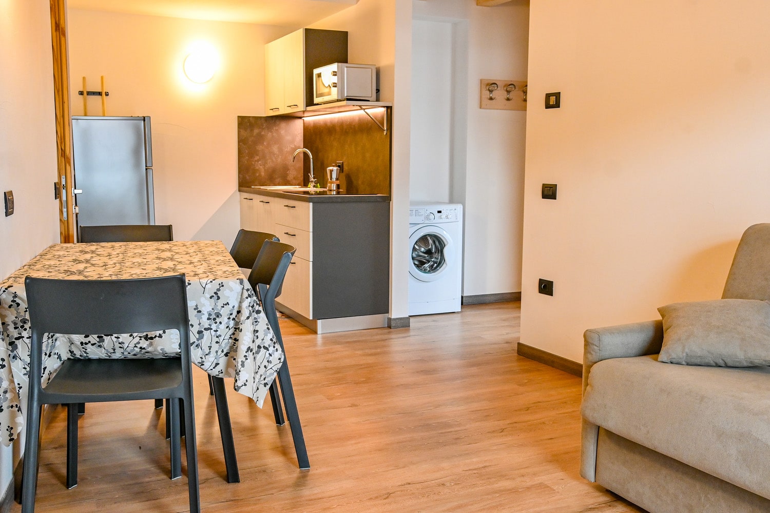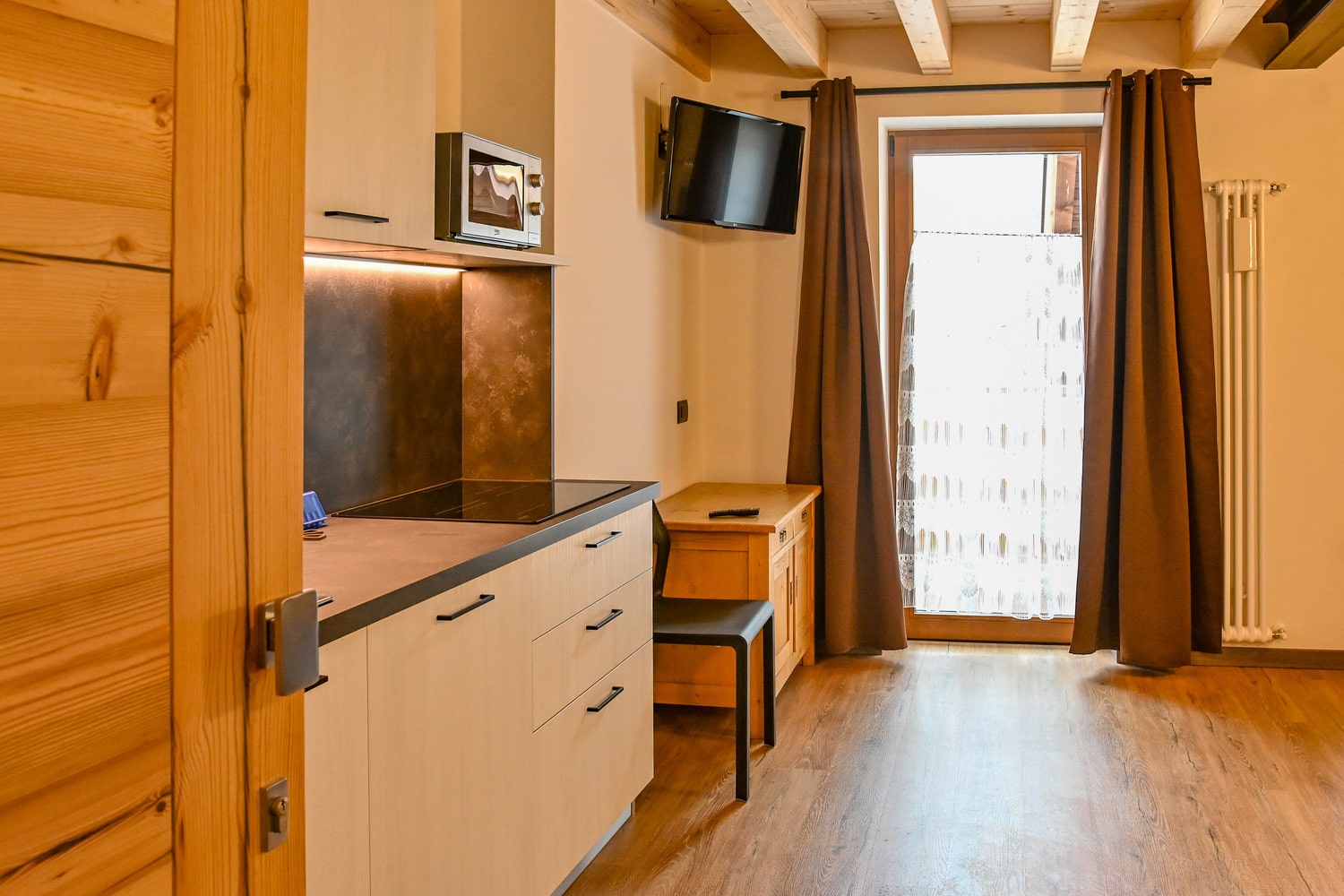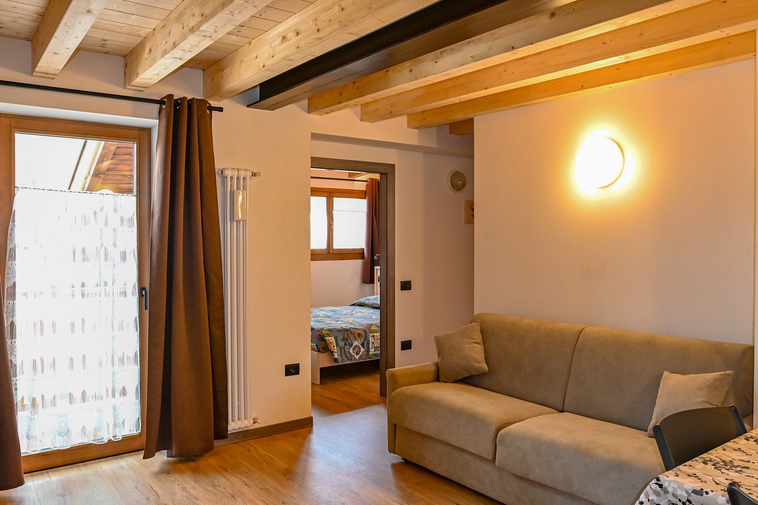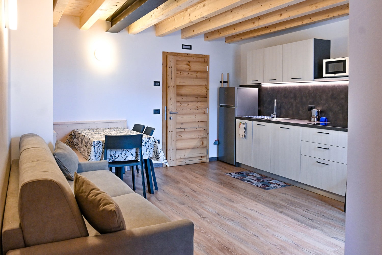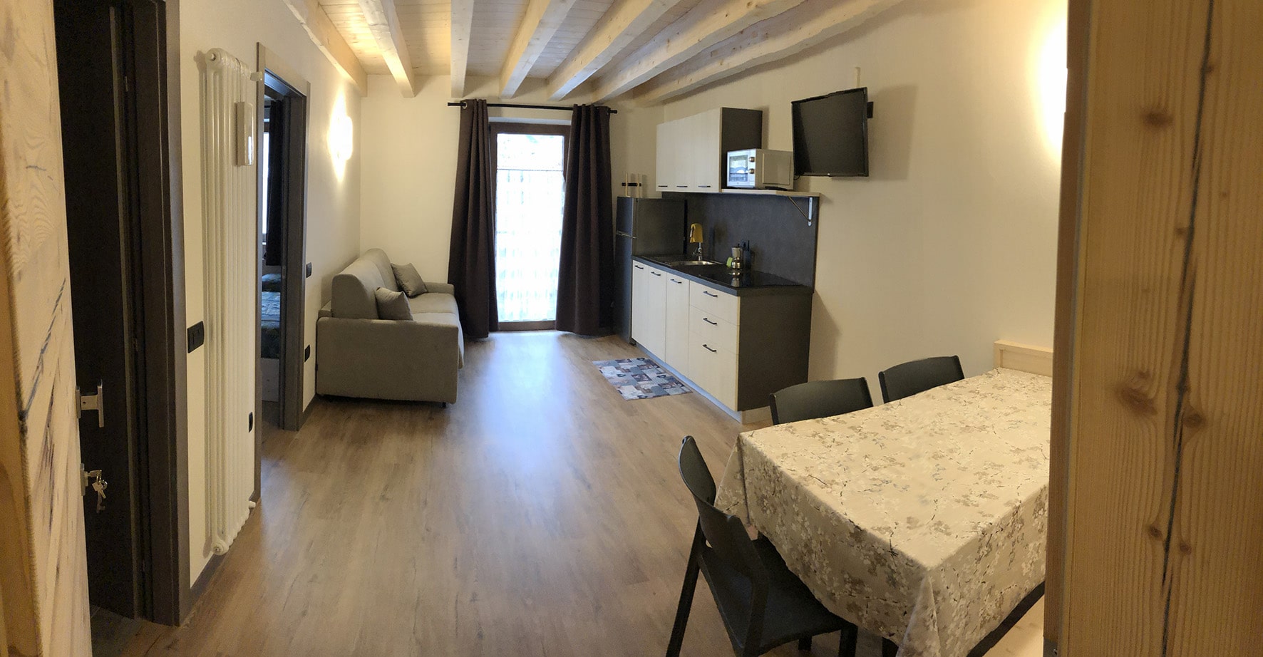 1 spálňa s manželskou posteľou s oddeliteľnými lôžkami a prípadne 1 samostatným lôžkom, obývacia izba s kuchynským kútom a rozkladacím gaučom pre 2 osoby, sociálne zariadenie, balkón; niektoré apartmány sú situované v podkroví