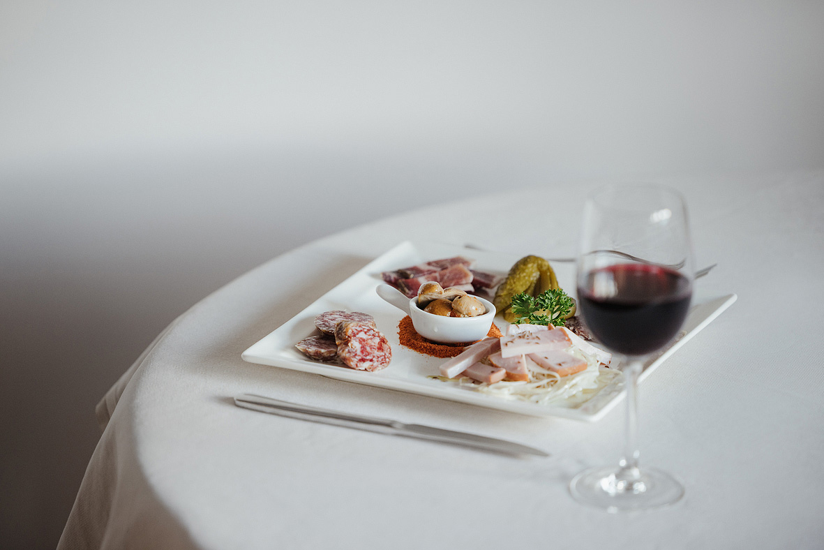 servírované menu s výberom z 3 hlavných jedál s prílohou, studené a teplé predjedlá formou bufetu, šalátový bufet, servírovaný dezert a ovocie, nápoje za poplatok