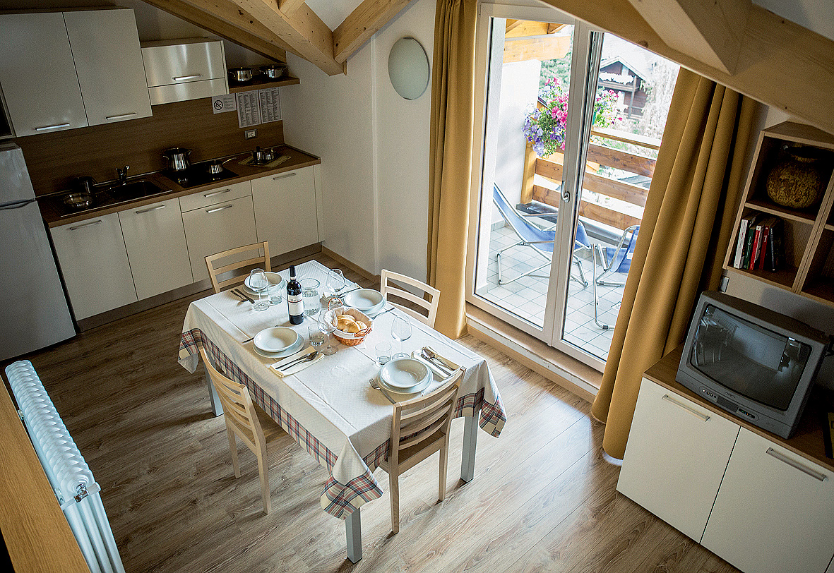 65 m² - 1 spálňa s manželskou posteľou, 1 spálňa s 2 samostatnými lôžkami, 1 spálňa s 1 samostatným lôžkom a poschodovou posteľou, obývacia izba s kuchynským kútom, 2x sociálne zariadenie so sprchou (len niektoré apartmány; ostatné 1x so sprchou, 1x len umývadlo a WC; pri 2 apartmánoch vstup zo spálne so samostatnými lôžkami), balkón