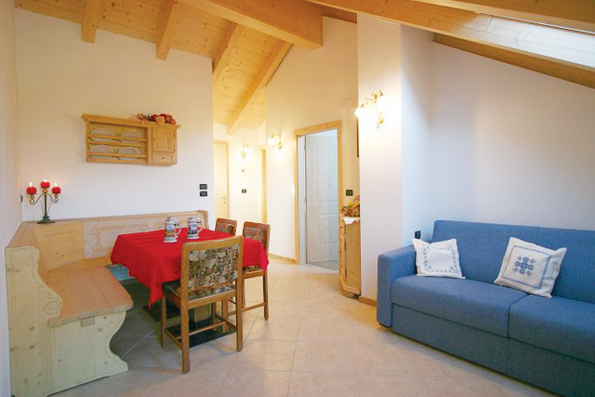 80 m² - 1. podlažie apartmánu: obývacia izba s kuchynským kútom a rozkladacím gaučom pre 2 osoby, sociálne zariadenie; 2. podlažie apartmánu (podkrovie): 3 spálne s manželskou posteľou (v 1 z nich sú lôžka oddeliteľné), sociálne zariadenie