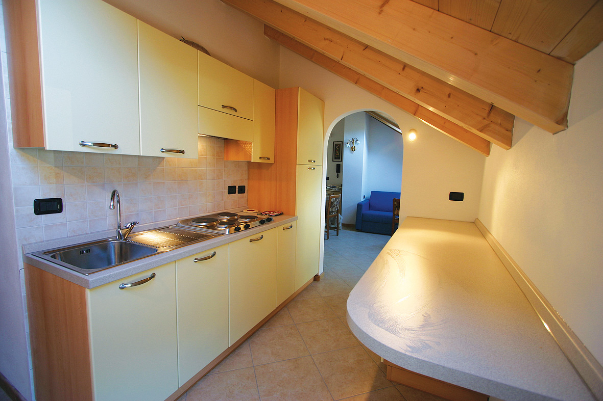 trilo 7 - 56 m² - 1 spálňa s manželskou posteľou, 1 spálňa s manželskou posteľou s oddeliteľnými lôžkami alebo 2 samostatnými lôžkami, obývacia izba s kuchynským kútom, rozkladacím gaučom pre 2 osoby a rozkladacím gaučom pre 1 osobu, 2x sociálne zariadenie (1x len umývadlo a WC ); apartmán je situovaný v podkroví